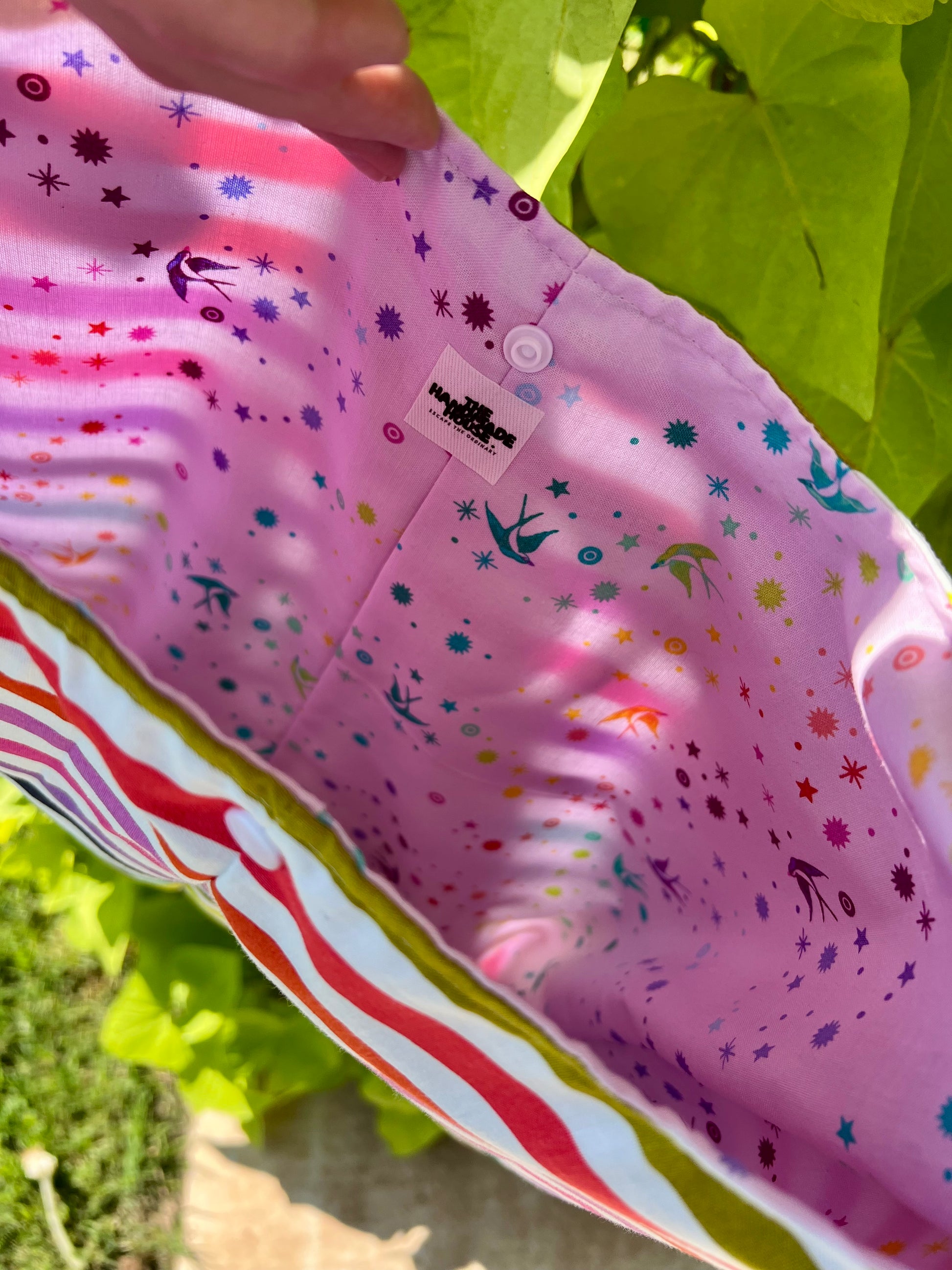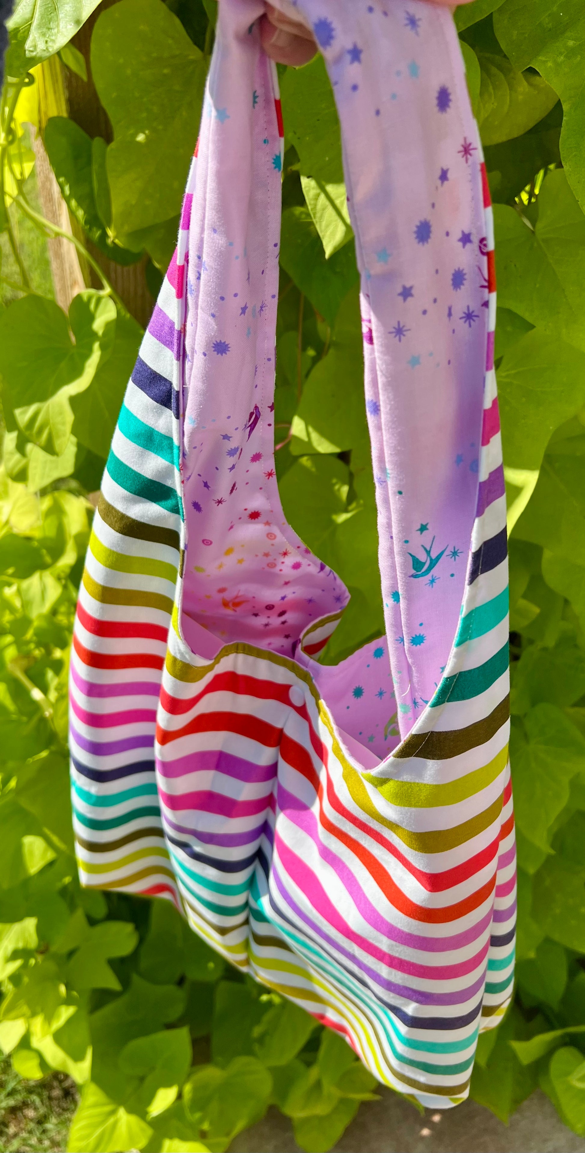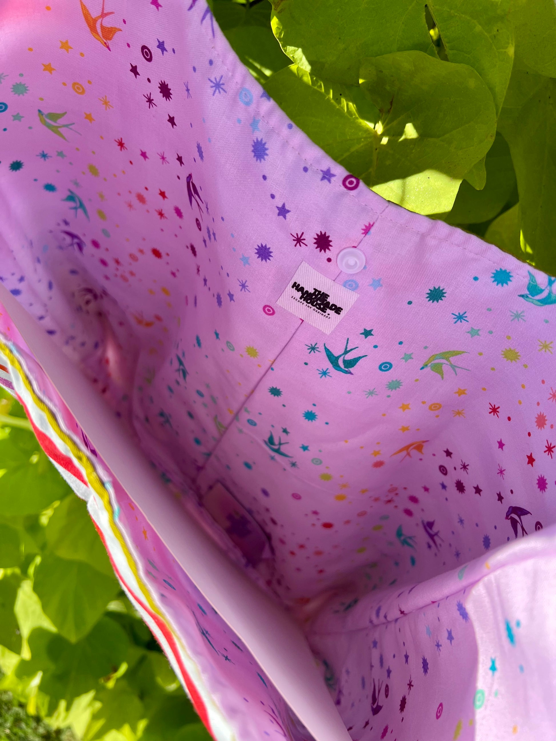 Rainbow stripe slouch bag with rainbow sparrow sparkle inside lining. Made out of eco friendly 100% cotton fabric and a snap closer to keep your belongings safe!